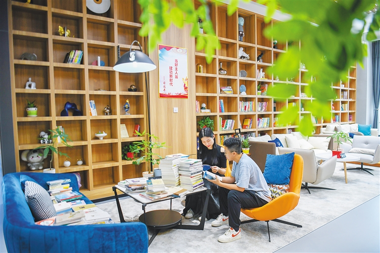10月14日,在海口市龙华区海垦控股集团总部职工服务中心,员工们利用下班时间看书、休闲。