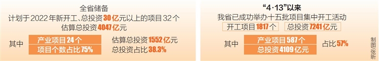 “4·13”以来,省发展改革委已牵头成功举办十五批项目集中开工活动,开工项目1817个,总投资7241亿元,其中产业项目587个,总投资4109亿元,占比57%。通过密集举办项目集中开工,各级政府抓项目促投资的能力大大提高,全省形成了“抓大项目、大抓项目”的工作氛围,投资结构进一步优化,投资增速持续回升,有效对冲了新冠肺炎疫情和房地产调控对我省经济带来的双重不利影响。