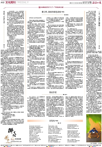叫不上名字的灌木丛和野芋头,太眼熟了。种类繁多的野生花卉却见所未见,闻所未闻。海南梧桐、刺桐、假杜鹃……在有限的空间里争分夺秒地葳蕤或盛开,就如江南人家养的盆景,无论大与小都要在恰当的时光里展示生命的底蕴。我以惊奇的目光,与它们对望,它们生命里的从容将我稳稳攫住,从肉体到灵魂。这里也是一个社会呀,只是没有人类能听得懂的语言罢了。