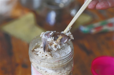 鱼茶的制作并不难,但也很讲究。将新鲜的鱼清理干净并晒干后,加入煮熟的米饭和盐巴,搅拌均匀后装进密封的坛子中,等待10天至15天就可以食用。