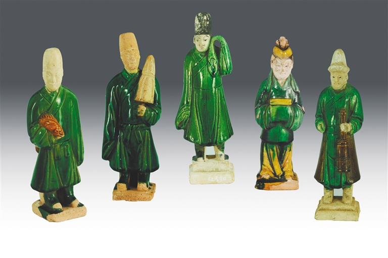 海南省博物馆曾推出“土火之艺——馆藏古代陶瓷展”,精选这批明代晚期三彩陶俑中7件代表性作品进行展览。其中包括乐俑2件、男性侍俑4件、女性侍俑1件。每件陶俑人物面容、姿态、服饰都不相同,呈现出7个性格鲜明的人物形象。这7件陶俑釉色以绿色为主,搭配装饰黄釉、褐釉,浓淡相宜。