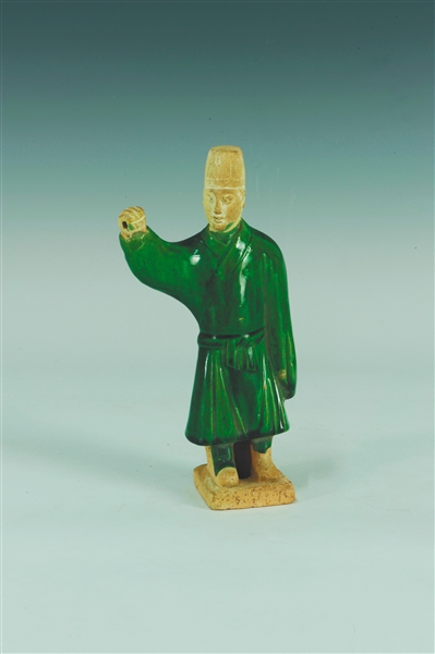例如其中的三彩持伞陶俑,通高19.8厘米,头戴六合统一帽,身穿右衽大衣,衣裙下摆至膝下,腰间系带,双脚蹬靴立于方台上;面部虽有磨蚀,但五官尚可辨识,头部微微右倾,目视前方,神情全神贯注若有所思;左手持伞,曲于腹前,伞中部有绳将伞束拢;陶俑脑后头发丝丝可见,刻划细致。此俑头、面部和手中所持长伞无釉施粉,鞋、服施绿釉,发色浓翠明亮,釉层厚重,鞋靴部位流釉明显。