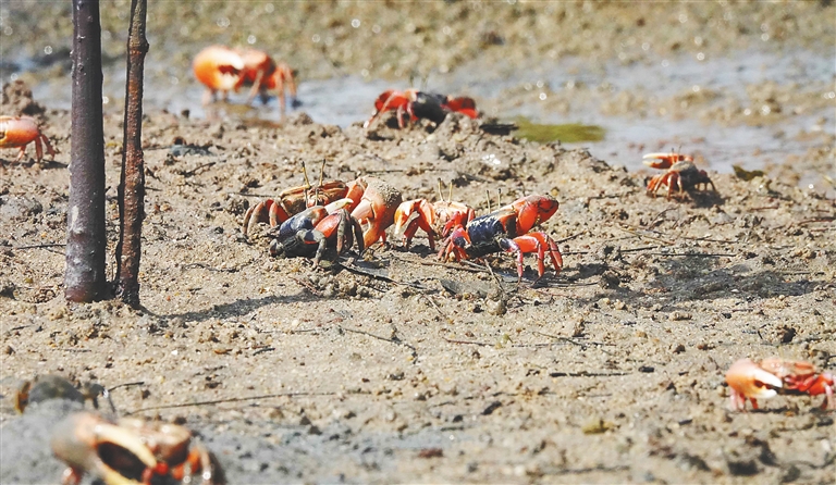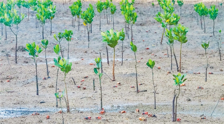 近日,在儋州市儋州湾湿地生态修复项目现场,成群结队的招潮蟹在红树林下安家觅食,昔日虾塘变绿洲,栽种的红树林长势喜人。