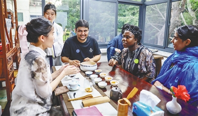 近日,外籍教师在海南大学国际学者中心品尝中国茶道。
