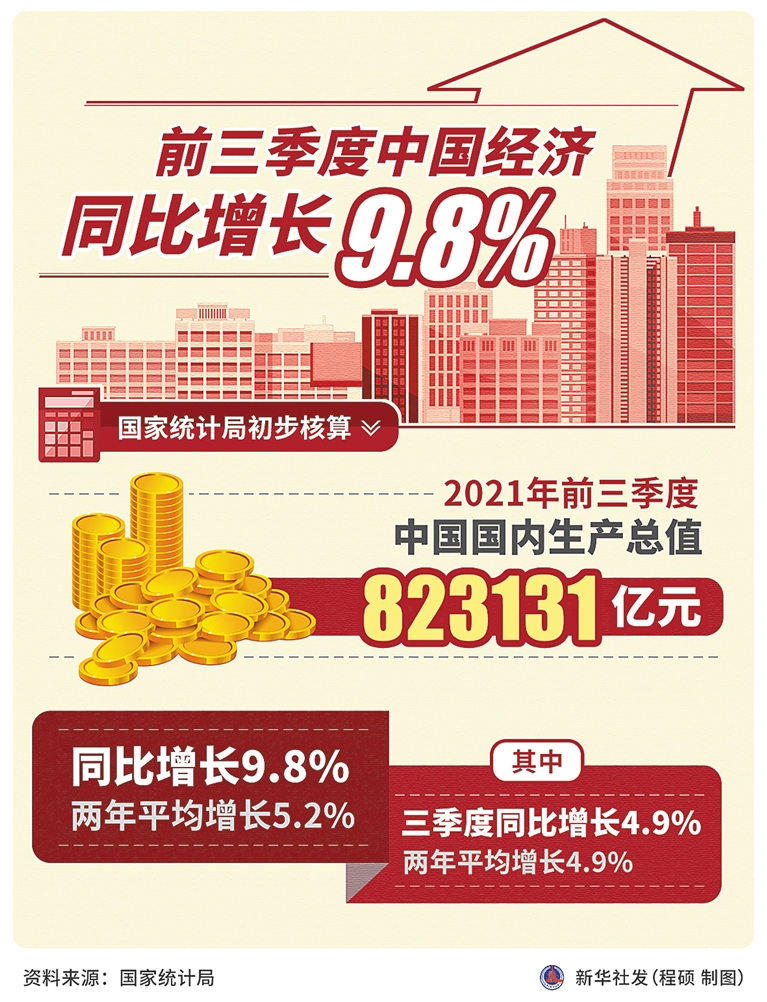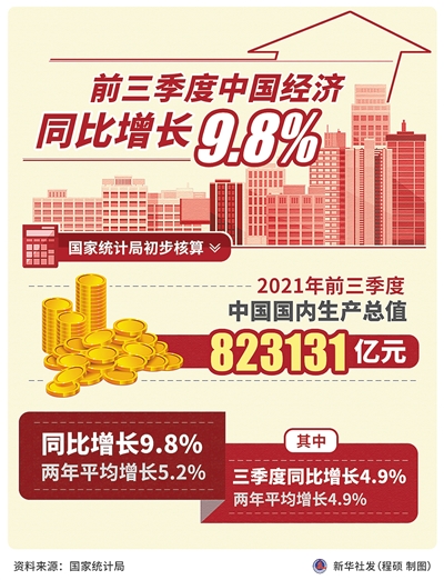 国家统计局18日发布数据显示,初步核算,前三季度国内生产总值823131亿元,同比增长9.8%,两年平均增长5.2%,比上半年两年平均增速回落0.1个百分点。