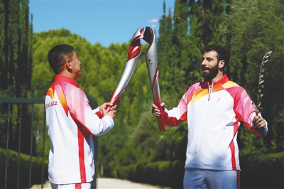 乔治乌将燃起的火炬及象征和平与荣耀的橄榄枝传递给第一棒火炬手——手持北京冬奥会火炬“飞扬”的希腊高山滑雪运动员扬尼斯·安东尼乌