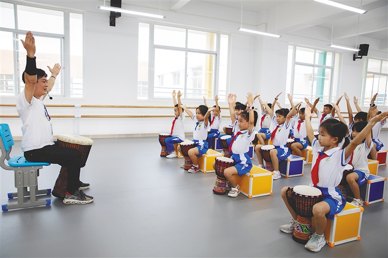 在该校指导学生学习非洲鼓的教师陈星星来自一家校外音乐培训机构。他告诉记者,“我们除了做好日常教学工作,还会利用现有平台把学生带出学校、带上舞台参加比赛和演出,帮助他们增强自信心。”