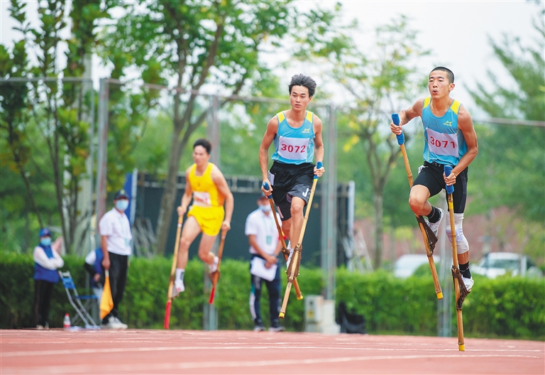 图为运动员在全国高脚竞速比赛中。本报记者 曾毓慧 通讯员 刘杰/文 本报记者 袁琛/图