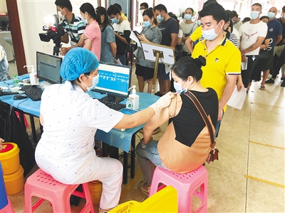 本报海口10月21日讯(记者计思佳 特约记者陈创淼 通讯员蔡翔任)“打完疫苗要留观半小时。回家后注意不要激烈运动,不要吃辛辣食物”……10月21日,在海口秀英区在海秀镇水头村村委会大院内,医护人员对刚刚接种完疫苗的村民叮嘱道。