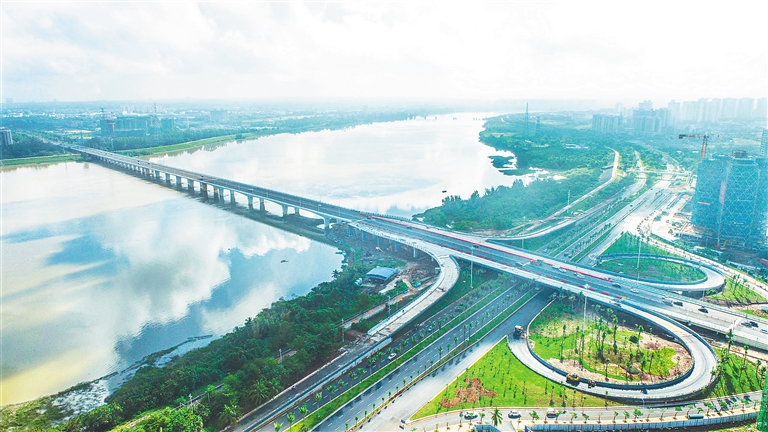 10月21日,俯瞰海口海瑞大桥与滨江西路互通立交项目。该项目预计11月底完工,建成后将优化江东新区和主城区的互联互通,同时缓解城市主干道椰海大道的通行压力,打通滨江西路南北方向与海瑞大桥的连接,切实提升市民群众出行的便利程度。本报记者 张茂 摄