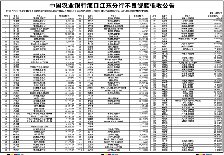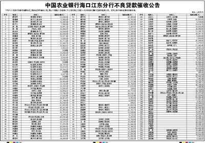 中国农业银行海口江东分行不良贷款催收公告
