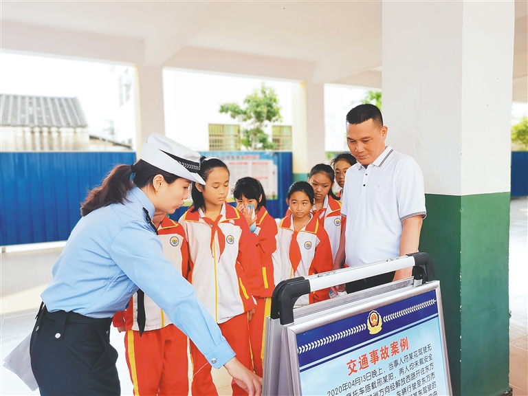 东方公安交警利用学生上下学时间,向学生及家长发放交通安全常识手册并粘贴宣传海报,讲解涉及中小学生的典型案例。东方市公安局供图