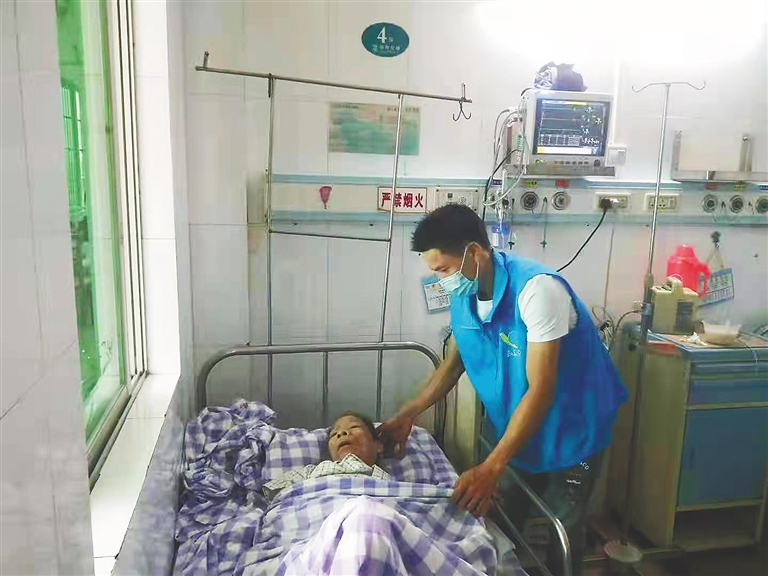 东方市民政局为困难群众购买了住院护理保险,委派专业生活照料护理机构的护工为住院困难群众开展连续24小时照料护理。图为护工在东方市人民医院照顾东河镇亚要村低保户符圣才。东方市民政局供图