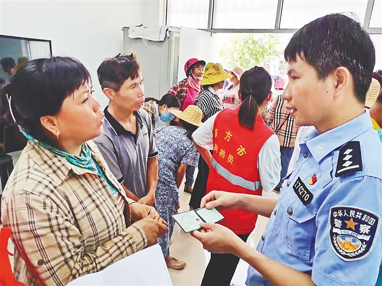 东方市交警大队利用周末时间走进八所镇罗带村,举办“流动车管所”便民服务活动,现场为群众解答各种车驾管业务。东方市公安局供图