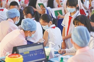 海口市英才小学副校长邱启秀介绍,全校学生共2966人,其中六年级9个班级共480余人,符合接种条件的六年级学生约460人。“按照从高年级到低年级的接种顺序,预计本周内全校学生能全部完成接种。”