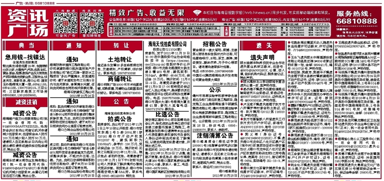 现受委托,我公司于2021年11月2日上午10时公开拍卖:海口市世贸东路2号D栋2004房〔琼(2016)海口市不动产权第0012037号,建筑面积为133.53m2〕,参考价:130万元,竞买保证金:20万元。展示时间:见报之日起至2021年11月1日。展示地点:标的所在地。有意者请于2021年11月1日下午5时前与我公司人员联系了解详情并办理相关竞买手续。拍卖地点:海口市华海路安海大厦8A4房。联系电话:0898-66243059 熊先生