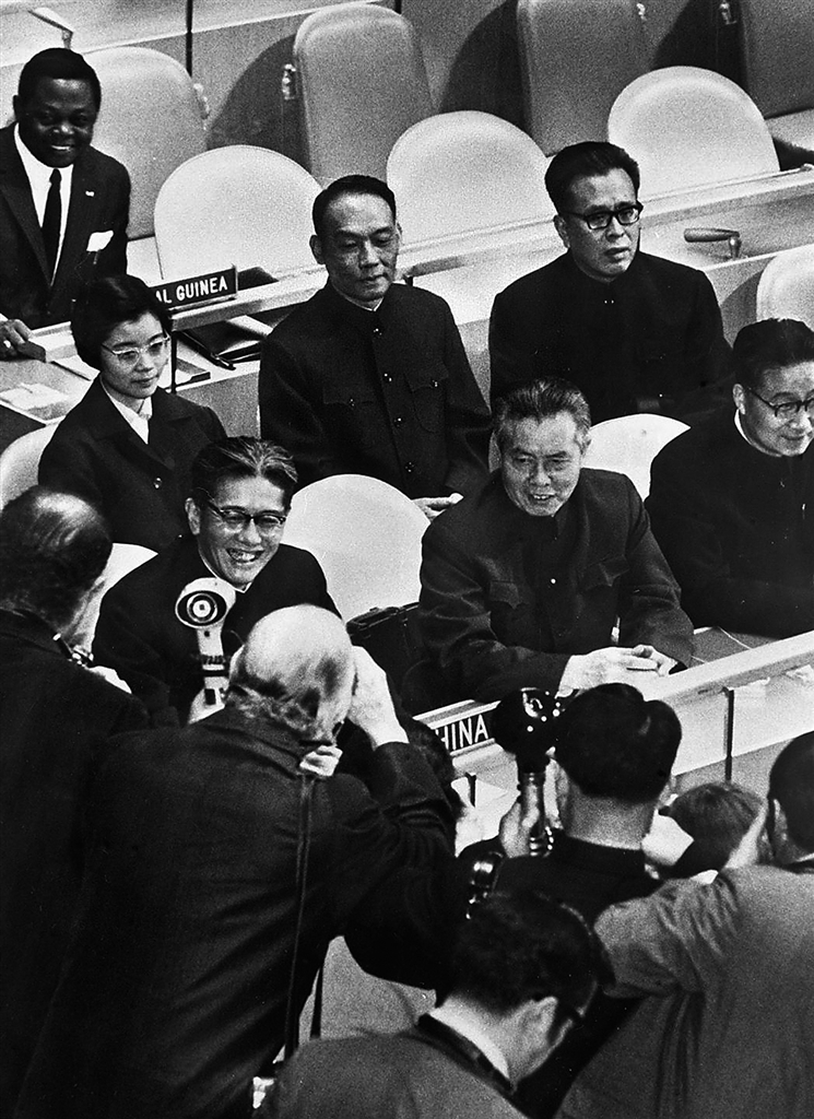 1971年11月15日,中华人民共和国代表团首次出席联合国大会。热烈的气氛弥漫了整个会场,57国代表相继致辞欢迎中国代表团。团长乔冠华在联合国讲台上向世界宣告:“我们主张,任何一个国家的事,要由这个国家的人民自己来管;全世界的事,要由世界各国来管;联合国的事,要由参加联合国的所有国家共同来管,不允许超级大国操纵和垄断……”会场上,掌声经久不息。