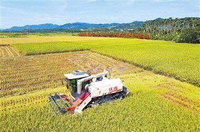 10月26日,在三亚崖州区南繁公共试验基地,收割机正在收割成熟的杂交水稻。 本报记者 武威 摄