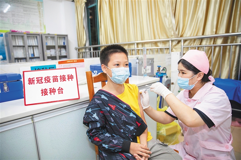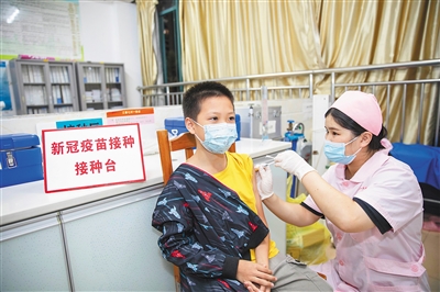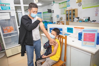 10月28日晚,在海口龙华区金盘社区卫生服务站,一位家长和10岁的孩子一同接种新冠疫苗。日前,海口市已全面启动3岁-11岁人群新冠疫苗接种工作,接种点均延长至21时下班。不少家长在晚上带孩子到接种点,除了让孩子接种第一剂新冠疫苗外,家长也积极接种新冠疫苗加强针。本报记者 李天平 摄