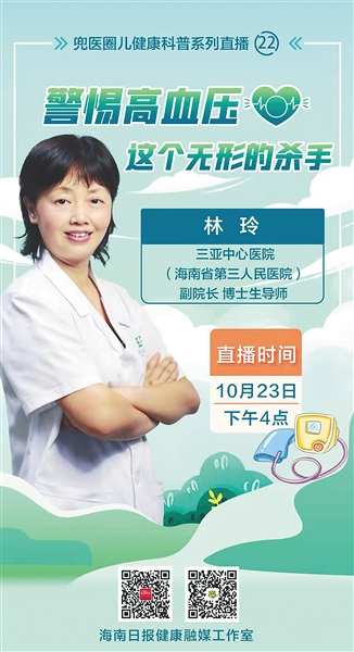 高血压是最常见的慢性病之一,也是导致心脑血管疾病的主要危险因素。高血压对人体有哪些伤害?该如何防治高血压呢?10月23日,海南日报健康融媒工作室《大医精讲》栏目推出系列健康科普直播第22期,邀请三亚中心医院(海南省第三人民医院)副院长、博士生导师林玲,在线分享高血压防治经验,为大家答疑解惑。