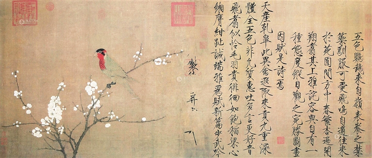 《五色鹦鹉图》中画的这只鹦鹉,是宋徽宗赵佶在宫廷御园中所见的五色鹦鹉。为纪念这个发现,于是将那只异国珍禽作了精致的描绘,旁以瘦金体书加上颂辞,为一赋一诗。落款有一部分虽已脱落,但仍认得出来。