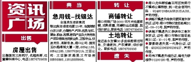 银达典当诚信经营23年,全国连锁分店25家,办理房产、汽车、名表、钻石、黄金、铂金、股票、数码产品及大宗房地产项目等典当贷款业务。正规专业、快速灵活、高额低息。海口公司:国贸玉沙路椰城大厦一层。68541188、68541288、13307529219。三亚公司:三亚解放路第三市场旁 88558868,13518885998。