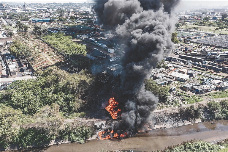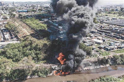 南非德班一处工业园区发生油罐车起火事故并引发次生火灾,已造成2人丧生,事故地点周边500米范围内的居民被撤离。新华社/法新