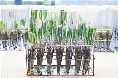 “这是橡胶树组培苗,又叫自根幼态无性系或体胚苗,是橡胶树第三代种植材料。它们相当于橡胶苗里的‘克隆军’。”中国热科院橡胶研究所良种良苗研究室主任黄天带介绍说,这些橡胶苗在试管里长到10厘米左右,就可以移栽到温室大棚内,再长到60厘米,就可以移到地里定植。