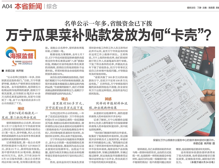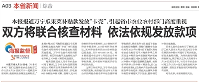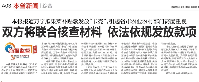 今年8月,针对部分万宁市菠萝收购商反映迟迟未领到已公示一年多的疫情期间瓜果菜补贴款问题,记者深入万宁市调查采访,并联系省农业农村厅核实,于8月25日在“海报监督”栏目刊发了《万宁瓜果菜补贴款发放为何“卡壳”?》一稿,引起各界高度重视。随后,本报又在8月26日、27日分别刊发追踪报道《双方将联合核查材料 依法依规发放款项》《本周完成复核 补贴应发尽发》,有力推动问题加快解决。