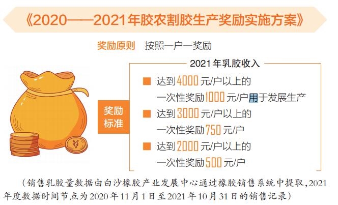 此外,白沙还同时出台《2020——2021年销售鲜乳胶奖励实施方案》提出,于11月1日起实行“开割得奖励,不开割不得奖励”原则,奖励对象为本地户籍胶农,按照每公斤干胶补贴0.5元,每亩补贴金额不超过60公斤,即每亩补贴不超30元。到时,白沙有关部门将对报送申请资金的材料进行审核,按照便民高效、资金安全的原则,通过邮储“橡胶丰收卡”兑现胶农奖励资金。