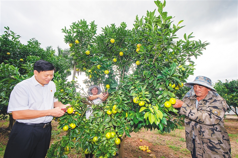 红橙满挂,丰收在即。11月2日,位于白沙黎族自治县七坊镇的一处红橙种植园里,种植户刘文漠在田头检查橙子成熟情况。往年这时,他总为销路问题伤神,但今年他显得十分淡定。