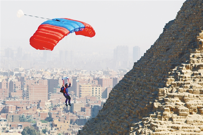 11月1日,在埃及吉萨金字塔景区,运动员进行跳伞表演。