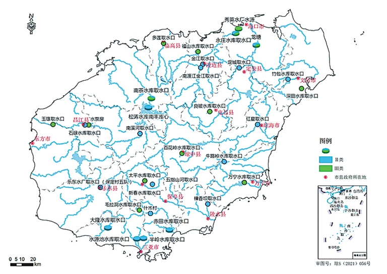 省控河流水质良好,水质优良比例为83.6%,Ⅳ~Ⅴ类比例为14.3%,劣Ⅴ类比例为2.1%。其中,昌化江流域和南海各岛诸河水质为优,南渡江和万泉河流域、西北部和南部诸河水质良好,东北部诸河水质轻度污染。140个监测断面中,塔洋河田头桥、珠溪河河口、腰子河加花岭村等3个断面水质重度污染;文教河坡柳水闸、罗带河罗带铁路桥、东山河后山村等3个断面水质中度污染;北门江中和桥、九曲江羊头外村桥、演州河河口、巡崖河巡崖村和龙湖镇、文昌江下园水闸、万泉河汀州、文教河潭牛公路桥、北山溪水崖新区、新吴溪鹿寨村和富文镇取水口、望楼河乐罗、半岭水海螺村、光村水凤山村、东方水东方农场十三队、春江河口、什候河新市农场三队桥等17个断面水质轻度污染,其余断面水质优良。超Ⅲ类断面主要污染指标为高锰酸盐指数、化学需氧量、总磷,断面超标率分别为10.0%、9.3%、7.9%。