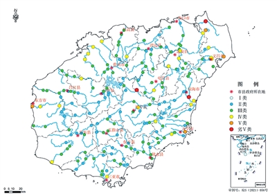 全省地表水水质总体良好,193个省控监测断面(点位)的水质优良(Ⅰ~Ⅲ类)比例为84.4%,同比①下降1.6个百分点;劣Ⅴ类比例为1.6%,同比上升1.1个百分点。19个市县中,文昌、儋州、琼海、东方、定安等5个市县水质轻度污染,海口、屯昌、临高、万宁、琼中等5个市县水质良好,其余市县水质为优。
