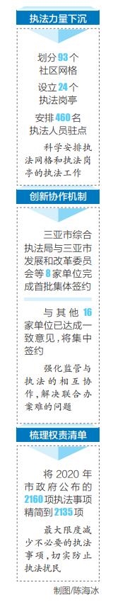 作为10个案例中的一例,创新执法协同联动机制名列其中。近年来,三亚推进综合行政执法改革,整合25个部门执法职责,由三亚市综合行政执法局统一管理,实行“一支队伍”管执法的新体制。通过推进执法力量下沉基层、建章立制构建联动机制、刚柔并济重服务等一系列举措,织密城市治理的“针脚”,在细节上花“绣花”心思、细微处下“绣花”功夫、细小处做“绣花”文章,破解一系列治理难题,扎实推进城市精细化管理工作,塑造出美丽鹿城的精致容颜,也让群众收获了实实在在的获得感和幸福感。