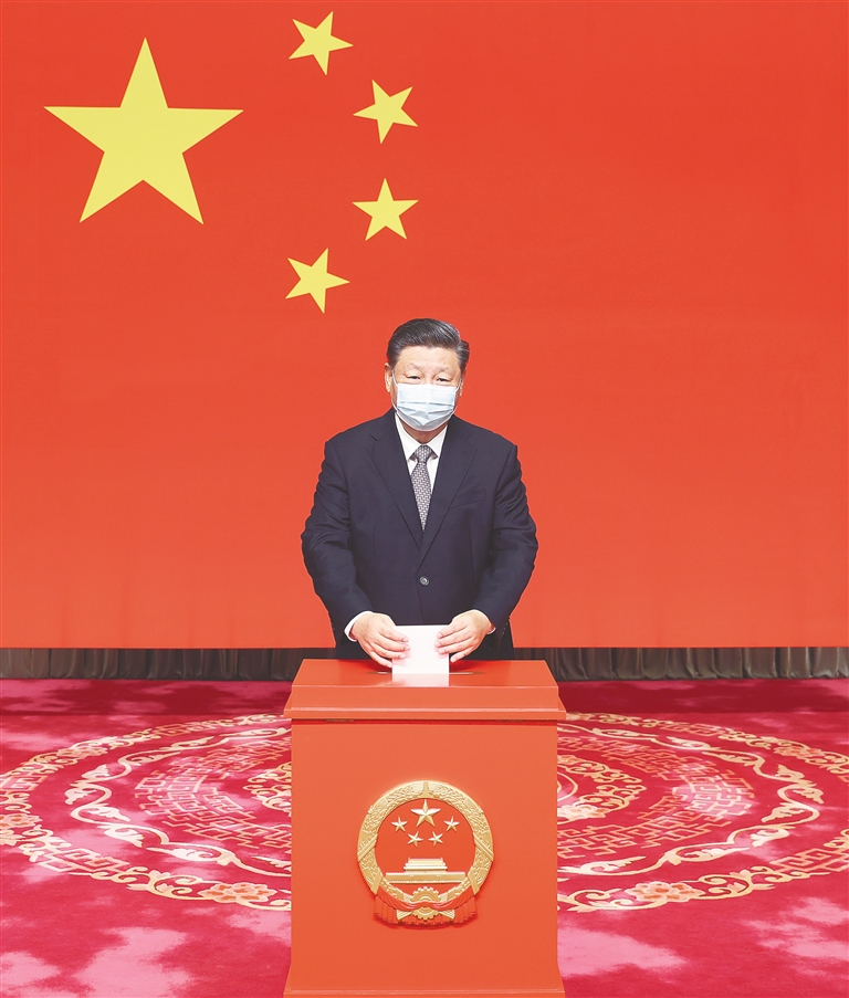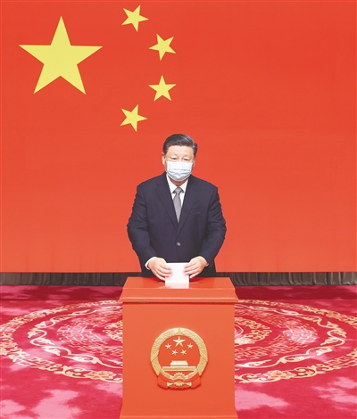 上午10时30分许,习近平来到怀仁堂投票站,仔细听取有关选举事项的说明,拿出选民证交给工作人员核验,领取一张选票,在写票处认真填写选票后,走到票箱前郑重投下自己的一票。