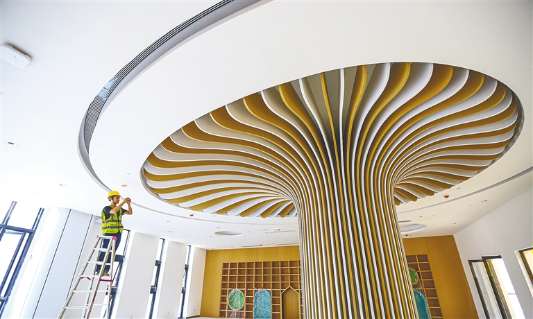 11月3日,在海南省图书馆二期项目少儿活动中心,工人进行室内设备的安装。目前,该项目竣工验收完成,预计明年年初正式对外开放。投入使用后将进一步满足海口人民群众的精神文化需求。本报记者 张茂 摄