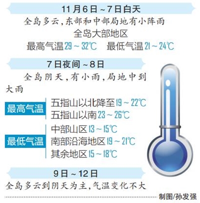 本报海口11月5日讯 (记者习霁鸿 通讯员符晓虹 杨仁勇 郝丽清)海南日报记者11月5日从海南省气象台了解到,预计7日夜间~8日,受强冷空气影响,全岛阴天,有小雨,局地中到大雨。最高气温五指山以北降至19~22℃,五指山以南23~26℃;最低气温中部山区13~15℃,南部沿海地区19~21℃,其余地区15~18℃。