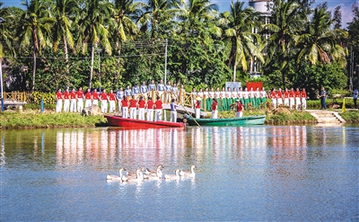 11月7日,在儋州市木棠镇薛宅村观景湖畔,村民唱起儋州调声,欢迎前来参观的客人。