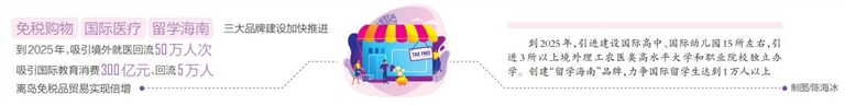 旅游消费品牌更加丰富。免税购物、国际医疗、留学海南三大品牌建设加快推进,到2025年,吸引境外就医回流50万人次,吸引国际教育消费300亿元、回流5万人,离岛免税品贸易实现倍增。