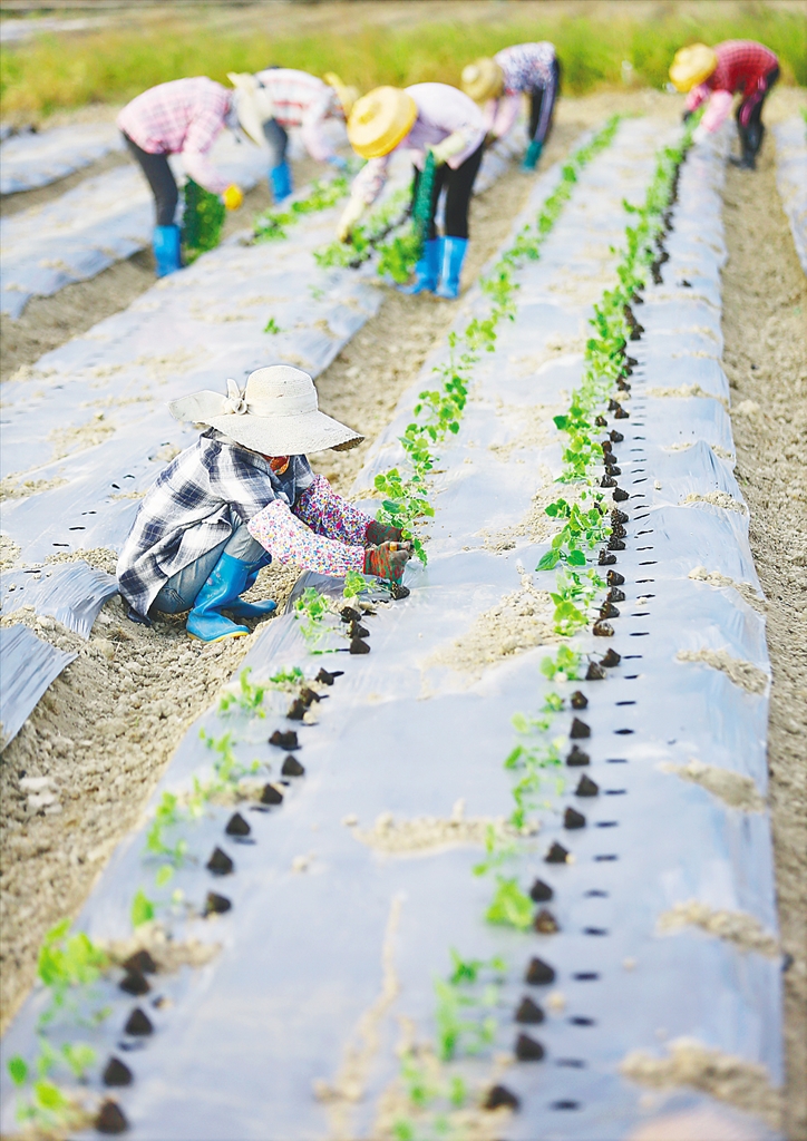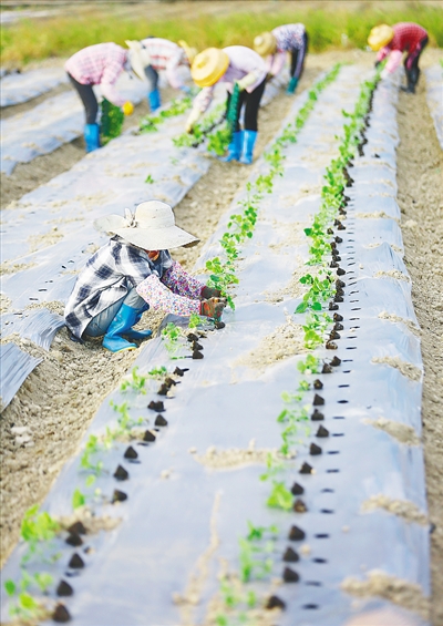 11月8日,三亚天涯区妙山村农民在田间移植青瓜苗。“立冬”过后,当地农民抓紧农时抢种冬季瓜菜。据了解,三亚今冬明春计划种植冬季瓜菜约15万亩(含复种),力争总产量突破47万吨。