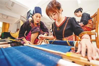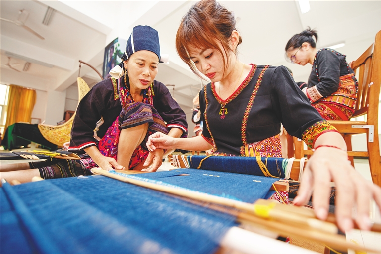 11月11日,在海南职业技术学院,学员王雪玲(右)在老师符玉指导下学习织黎锦。 近日,中国非遗传承人群研培计划2021年黎锦技艺研修班开班,吸引全省60名从事黎族传统纺染织绣技艺工作,并具有较高技艺水平的代表性传承人及行业内资深从业者参加。本报记者 袁琛 摄