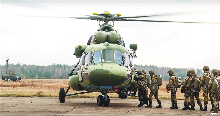 这张白俄罗斯国防部提供的视频截图显示,11月12日,演习部队在白俄罗斯西部靠近波兰边境地区准备登上直升机。