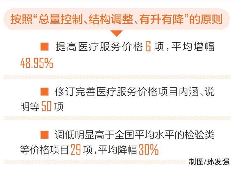 《通知》明确,按照“总量控制、结构调整、有升有降”的原则,提高医疗服务价格6项,平均增幅48.95%;修订完善医疗服务价格项目内涵、说明等50项;调低明显高于全国平均水平的检验类等价格项目29项,平均降幅30%。