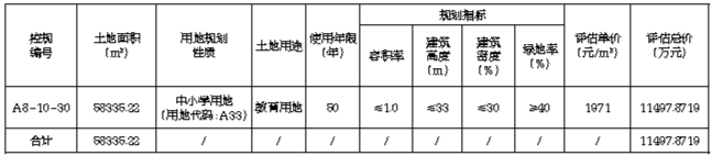 本次挂牌出让宗地位于海棠湾A8片区控规A8-10-30地块,CGCS2000坐标系面积58335.22平方米(海南三亚平面坐标系面积58310.50平方米),用地四至及界址坐标详见地块勘测定界图。该宗地规划用地性质为中小学用地(用地代码:A33),对应土地用途为教育用地。