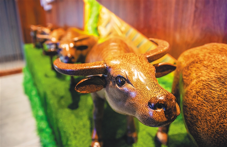 走进海南椰雕文化展览馆,首先映入眼帘的是一座高过人头的《吉祥如意樽》,该樽由1万多块雕刻了图案的椰壳拼接而成,呈现了“双龙戏珠”的形象,寓意“吉祥如意”。整体造型栩栩如生,雕刻工艺精湛。