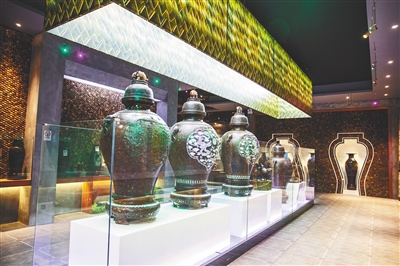 环顾四周,摆放着4件造型相似的《夜光宝瓶》,又称“将军瓶”,因镶嵌有用“夜光螺”壳雕刻的图案而被命名为“夜光宝瓶”。远远看去,经打磨的银白色贝壳,仿佛让巨形瓶身“穿”上了一套发光的衣裙,散发出耀眼的光彩。