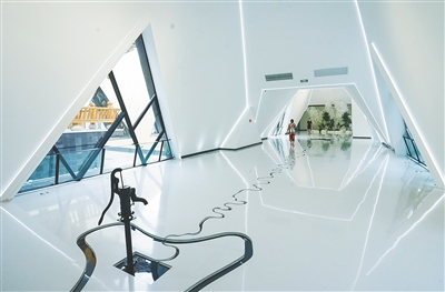 该艺术馆有一面巨大的玻璃墙,可以充分利用自然光线。玻璃墙外,是从高空垂直落下的水帘,给人以想象空间。馆内有《拟触象》《自在》《分身》等当代艺术品,这些作品造型独特,视觉冲击力强。馆内一处火山熔岩造型的下方,有一块精确到分秒的计时器。