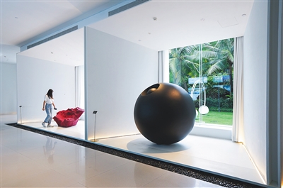 《春生》的主体是一个蓝色喇叭,在一片草地上,它与一件白色雕塑遥相呼应,寓意倾听大自然的声音,当春季来临之时,万物复苏,鸟鸣声、雨声、春雷声……一派欣欣向荣的景象,我们可以如此真切地“听”到春天;《夏长》的主体是红色海石花,红色海石花即海南红珊瑚,设计师精心设计珊瑚造型,展现海南红珊瑚的优美形态,折射夏季海底世界的活力;《秋收》主体为五色石,典出《山海经》,女娲以五色石补天,这一作品传递出设计者对中国优秀传统文化的推崇;馆内最为特别的艺术品是《冬藏》,一个黑色球形音箱,打破了人们对音箱的固有认知,让人有一种探索“声音世界”的冲动。