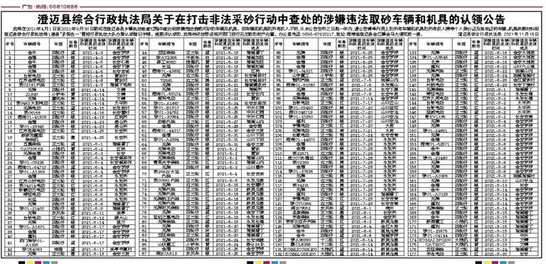 澄迈县综合行政执法局关于在打击非法采砂行动中查处的涉嫌违法取砂车辆和机具的认领公告